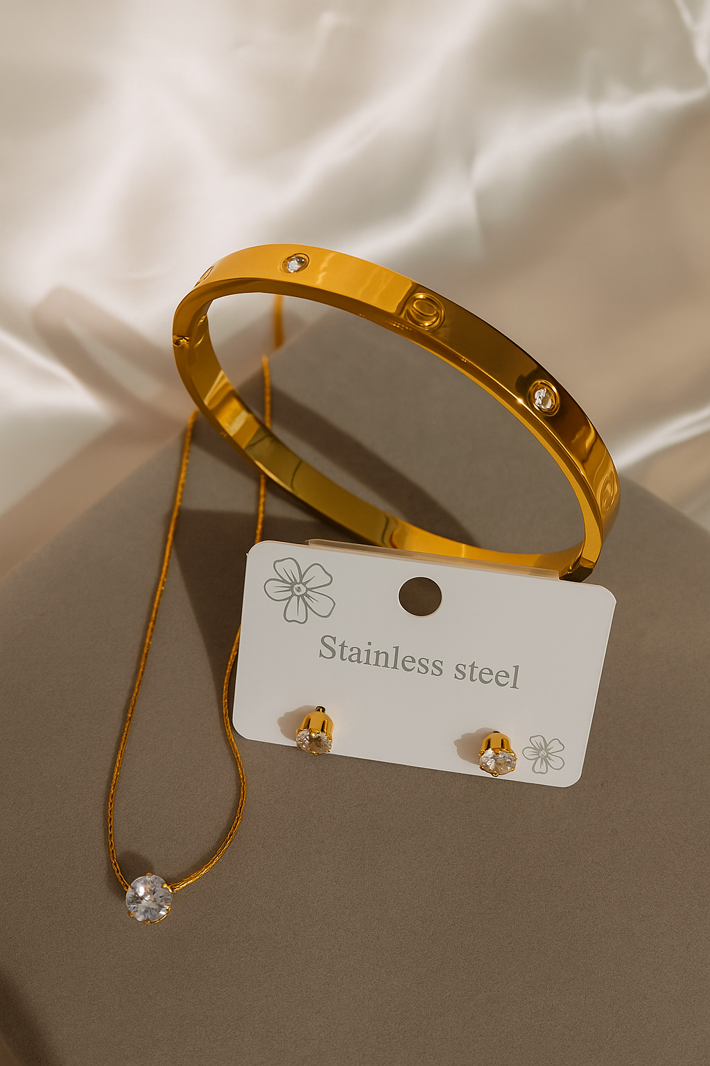 Our jewelry is crafted from premium stainless steel and 18K gold-plated for a luxurious finish that lasts. Each piece is made to give you the beauty of gold — without the high maintenance or fading.