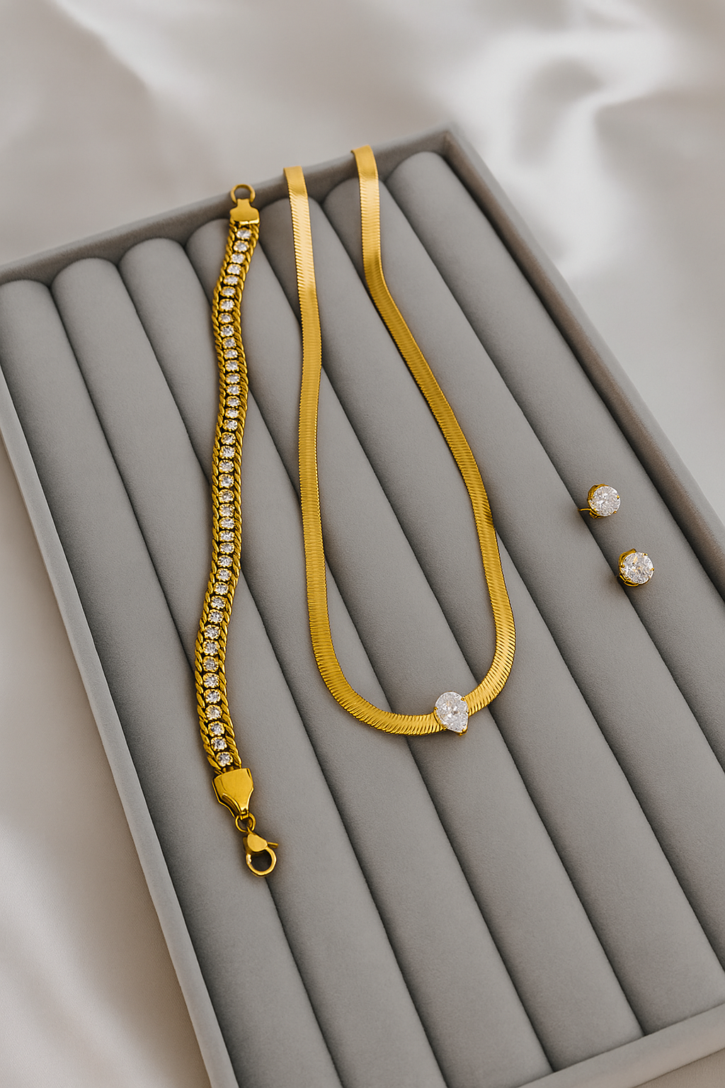 Our jewelry is crafted from premium stainless steel and 18K gold-plated for a luxurious finish that lasts. Each piece is made to give you the beauty of gold — without the high maintenance or fading.