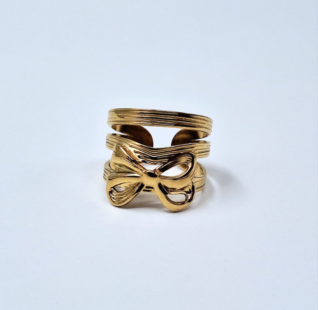 The ring feature an abstract layered design that some sources identify as a bow or Ribbon. The set creates a visually complex and bold look .